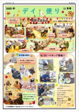 Topics 2025.11.02 デイ便り(11月号)を更新しました 2025.09.27 施設広報誌「笑顔」を公開しました。 2025.08.31 デイ便り(9月号)を更新しました 2025.07.31 8/1(金)花火大会延期のお知らせ 2025.07.26 介護体験フェア(8月中)開催します! 2025.07.21 デイ便り(8月号)を更新しました 2025.07.08 7/30(水) 当施設で市民公開講座開催します!