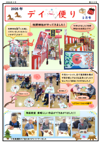Topics 2026.01.26 合同就職説明会を開催いたします 2026.01.05 デイ便り(1月号)を更新しました 2025.11.25 デイ便り(12月号)を更新しました 2025.11.02 デイ便り(11月号)を更新しました 2025.09.27 施設広報誌「笑顔」を公開しました。 2025.08.31 デイ便り(9月号)を更新しました 2025.07.31 8/1(金)花火大会延期のお知らせ